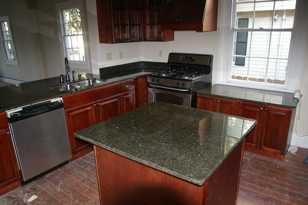 The counter tops in the main kitchen are made of granite, including the bar, and the cabinets are made of aluminum. We don't have a dishwasher. Like when we were young, we wash our dishes by hand.